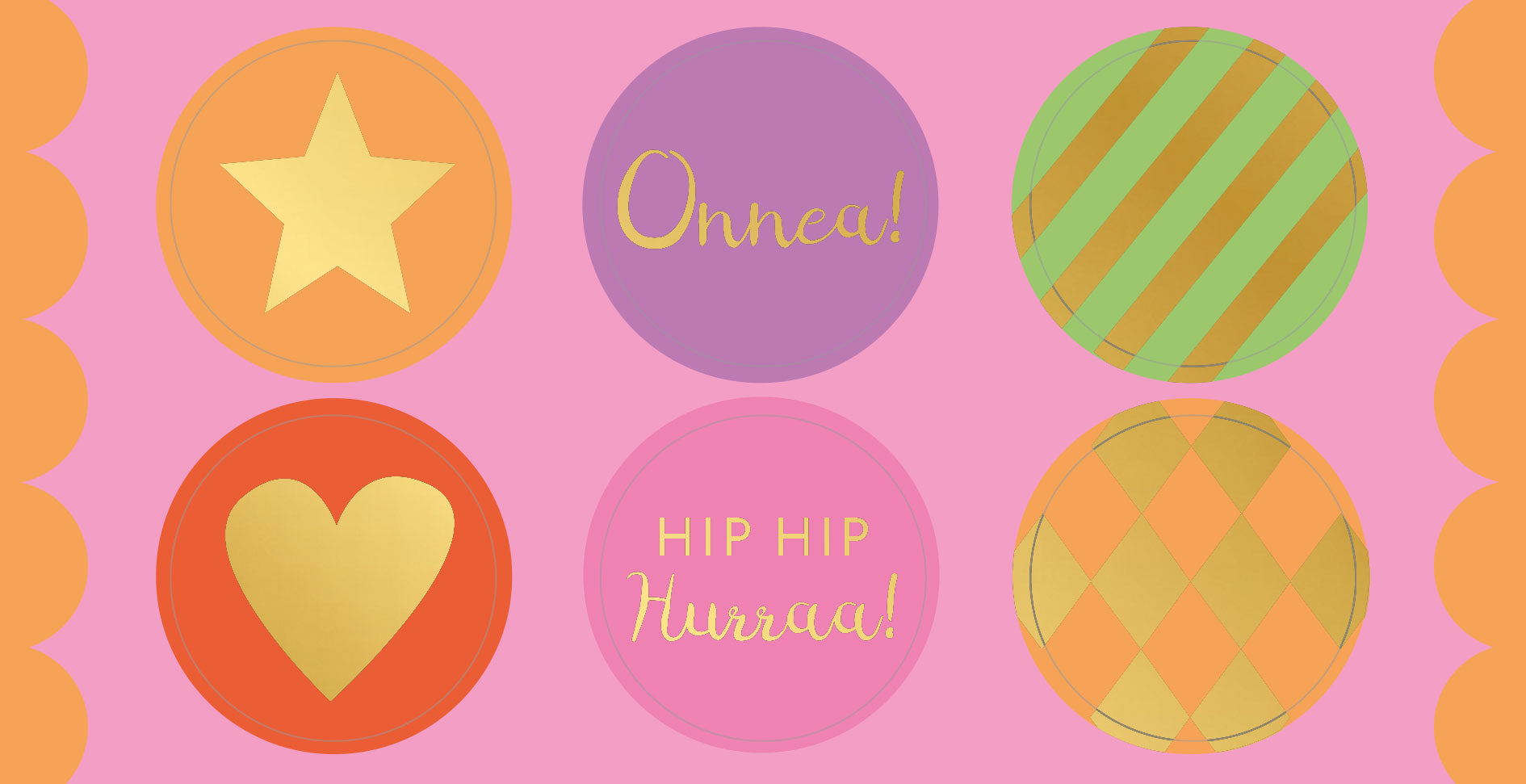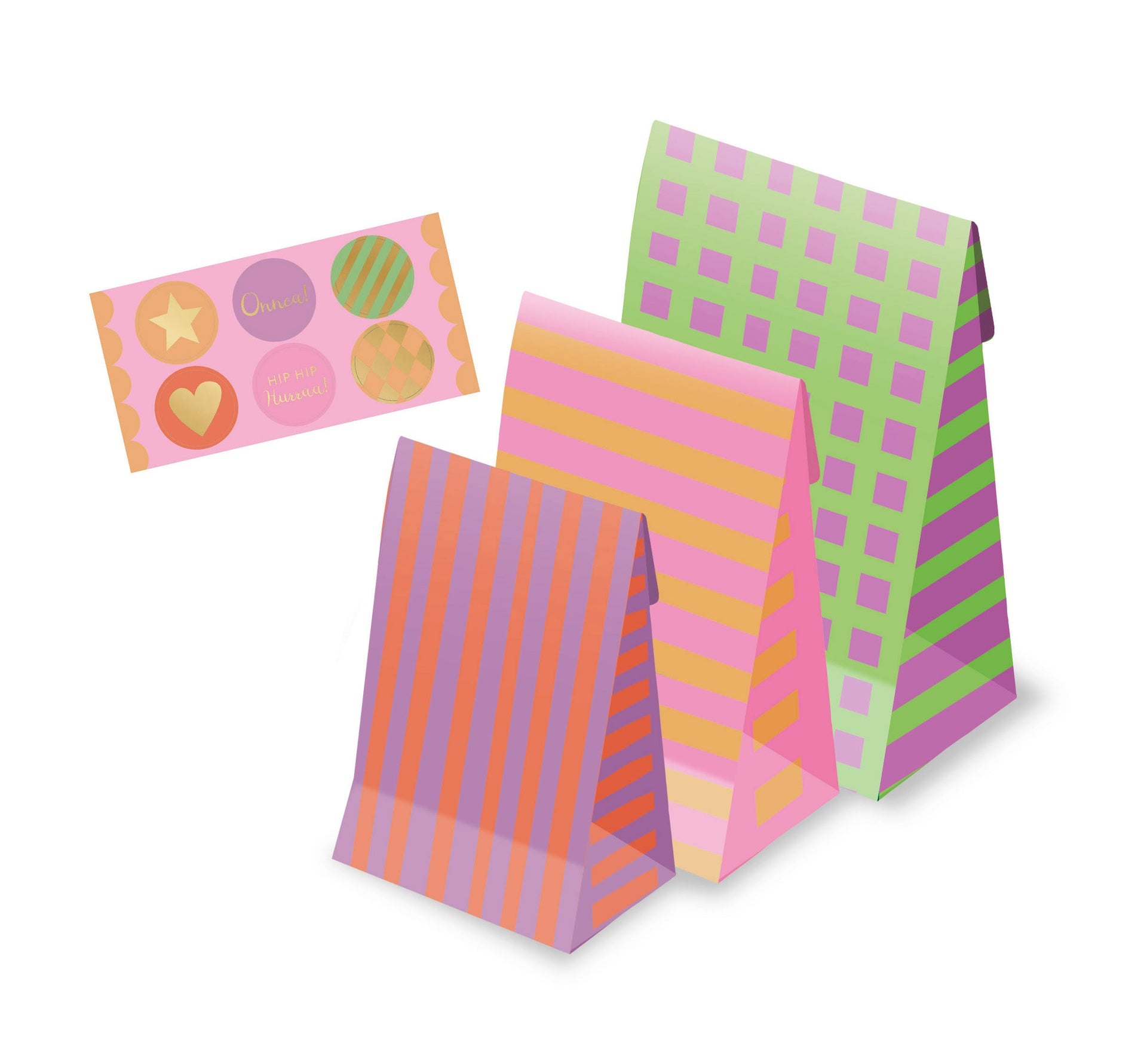 Lahjapussisetti laadukasta paksua paperia. 3 kpl erikokoisia lahjapusseja, pinkki-vihreä-oranssi, kuvioina raidat ja ruudut. Pussien koot ovat 100x160x30 mm, 140x200x30 mm, 65x245x40 mm. Pussin läpässä on tarrakiinnitys. Mukana tarra-arkki, jossa 6 kpl pyöreitä tarroja, Ø 35 mm, kahdessa tarrassa teksti: "Onnea!" , "Hip hip Hurraa!" Design: Putinki Moments.