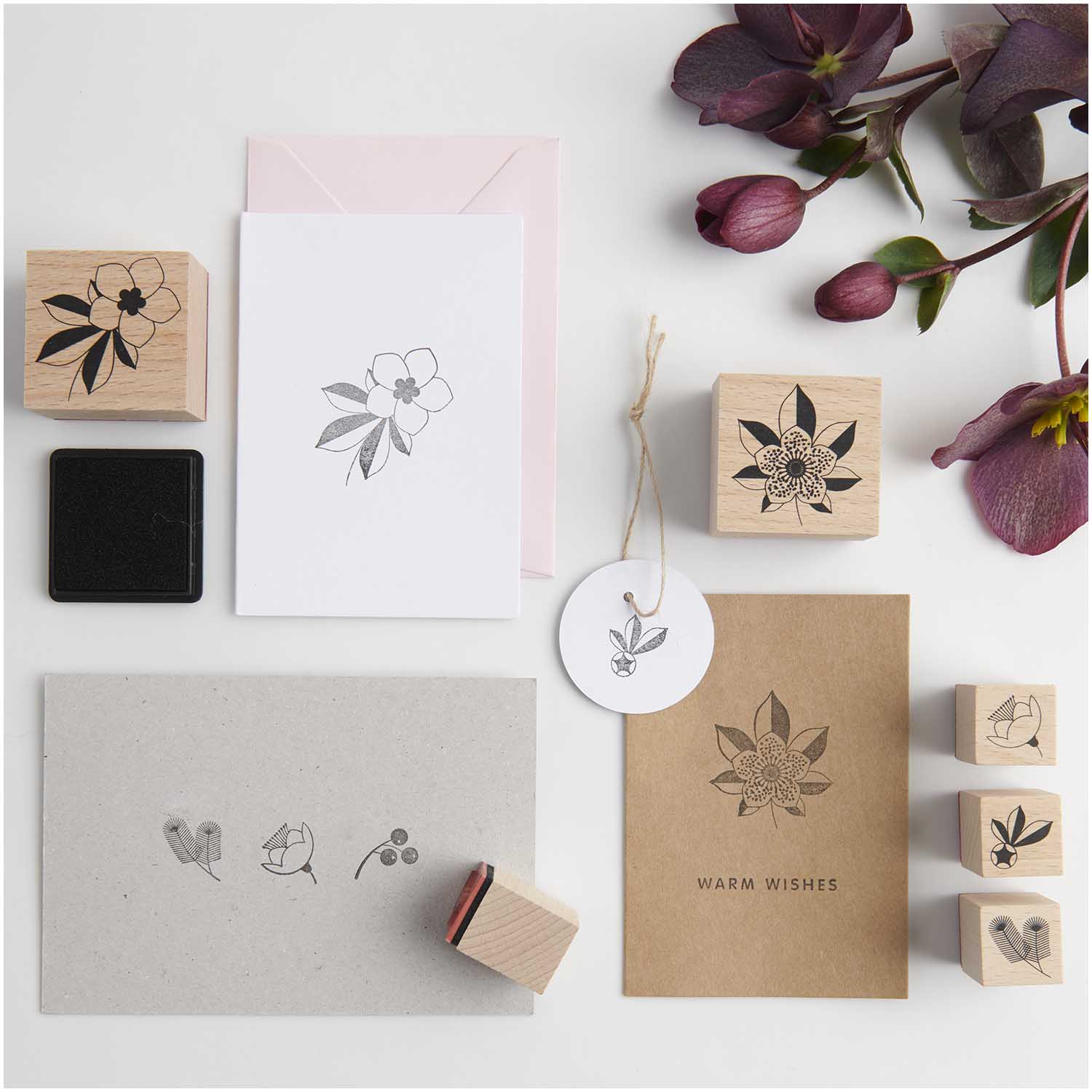 Rico Designin jouluinen leimasinsetti kukkakuvioilla. Pakkaus sisältää 6 leimasinta ja mustan mustetyynyn.