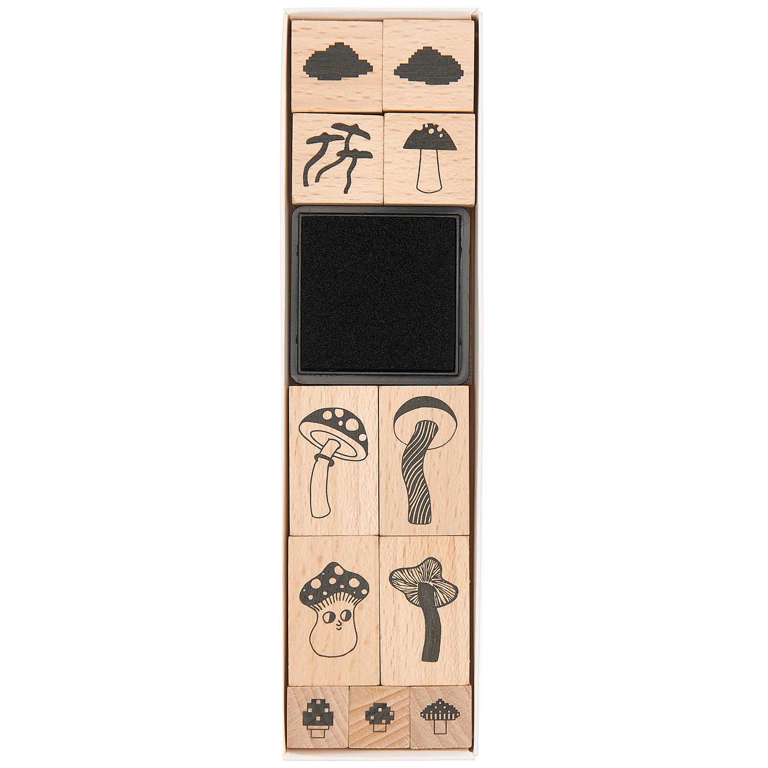 Puiset leimasimet sieni -teemalla. Setissä on 11 leimasinta ja musta leimasintyyny. Design: Rico Design