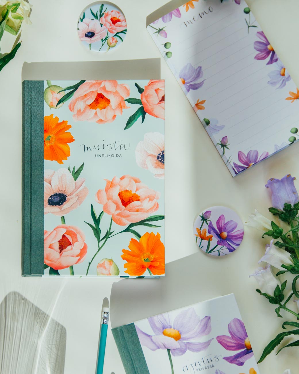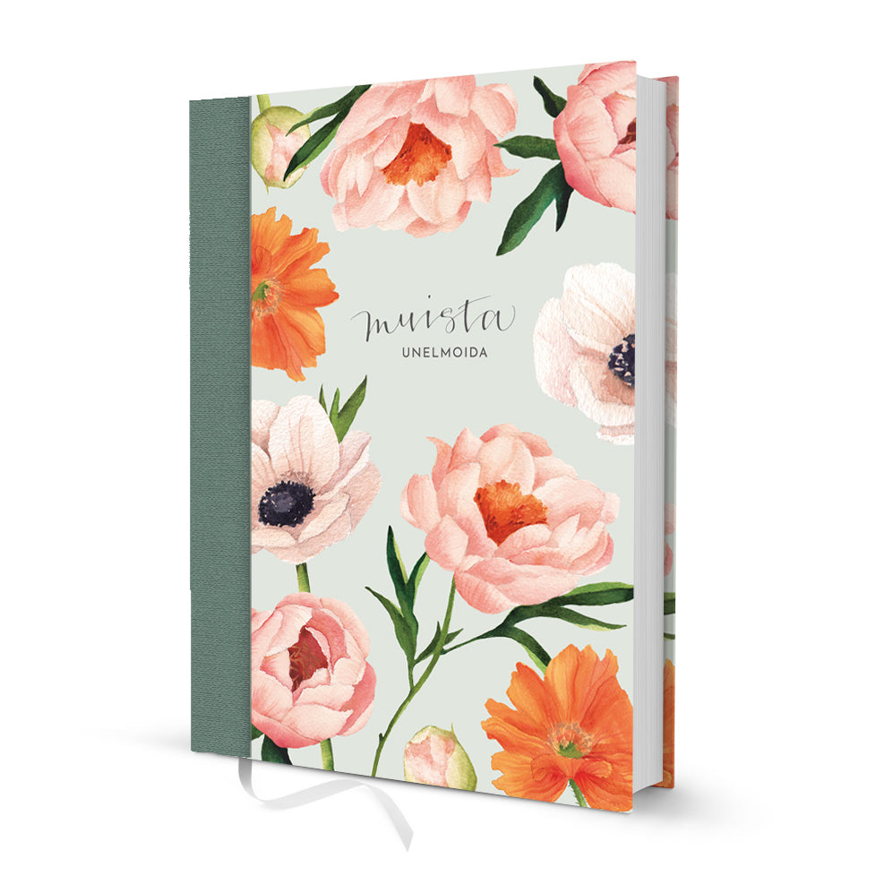 Kovakantinen muistikirja. Koko 14.5 x 21 cm (A5). 128 tyhjää sivua. Kangasselkä, värilliset esilehdet ja lukunauha. Paperilaatu Amber Graphic 120g. Design: Henna Adel.