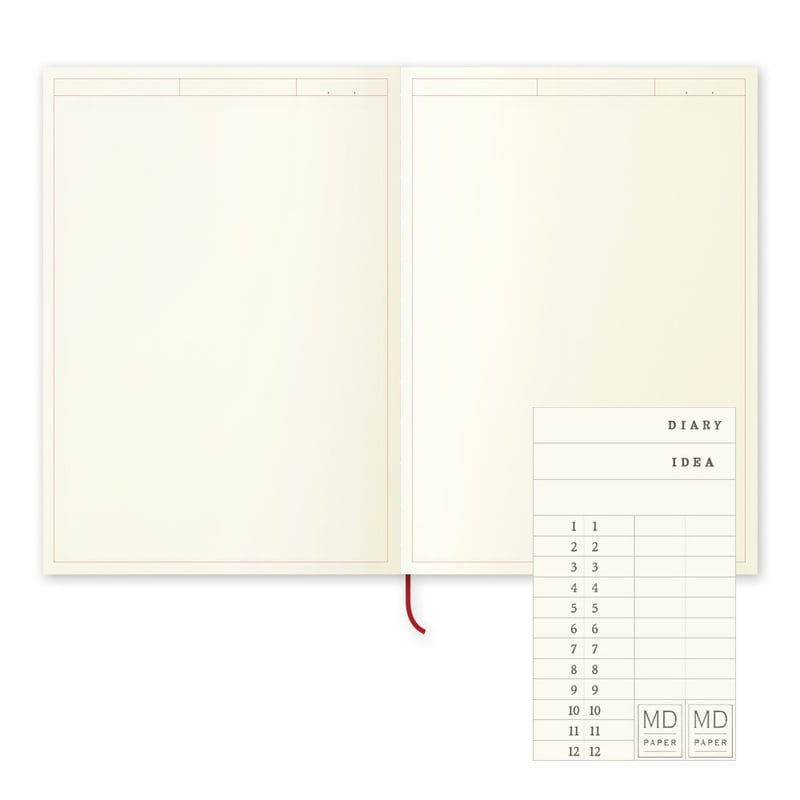 Pehmeäkantinen A5 kokoinen muistikirja Japanilaisen Midorin mallistoa. Valkoisen muistikirjan sivut ovat Midorin MD paperia (MIDORI Diary Paper), joka on sileää ja soveltuu hyvin erilaisille kynille säiliökynästä lyijykynään. Sivuilla on kehykset ja tyhjää tilaa, joka mahdollistaa luonnostelun lisäksi erilaisten taulukoiden, tai vaikka kalenterin tekemisen. Kirjassa on kaunis lankasidonta ja se aukeaa vaivattomasti. Kirjassa on 192 sivua, lukunauha ja lisänä indeksitarrat. Kirjan koko on 210mm x 148mm x 11mm.
