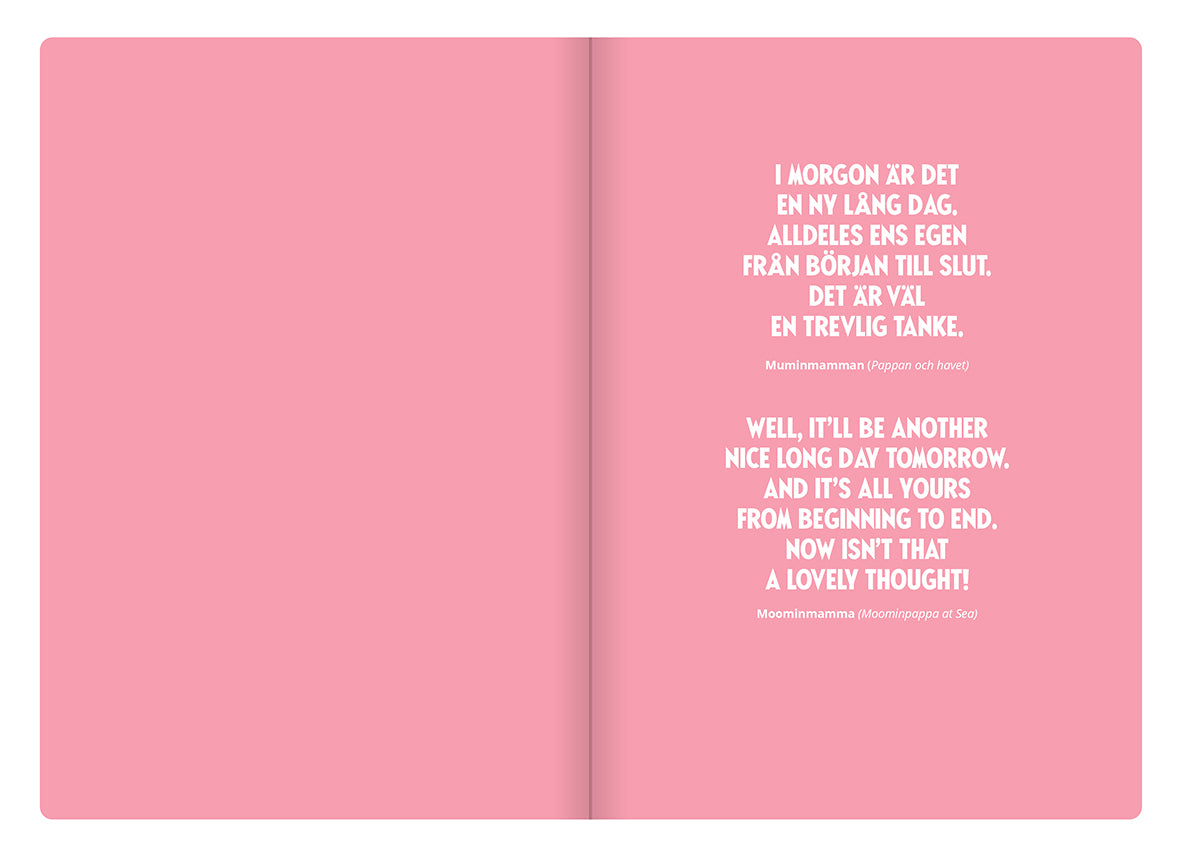 Pehmeäkantinen Putinki -muistikirja Muumi-sitaatilla. Kannessa teksti "Huomenna on uusi pitkä päivä, aivan jokaisen oma alusta loppuun se on hauska ajatus." Muumimamma (Muumipappa ja meri).