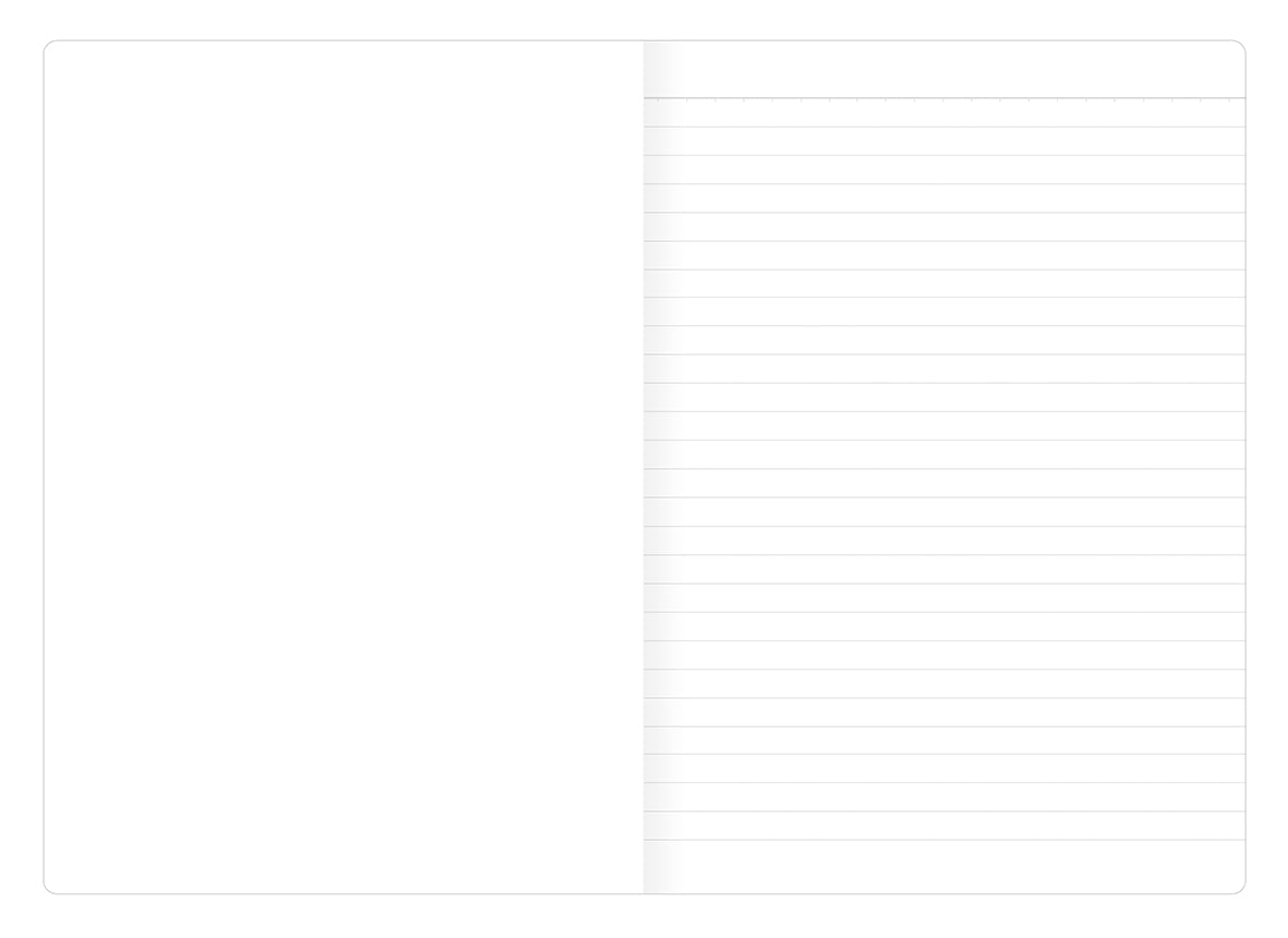 - Oikeat sivut viivoitettu ja vasen tyhjä. Kuminauhasulkija.
