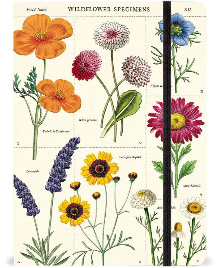 A5 kokoinen muistikirja Cavallini Wildflowers. Kannessa luonnonkukkia. 144 viivoitettua kermanvalkoista sivua. Tasku takakannessa. Kuminauhakiinnitys. Koko: 15 cm x 20 cm. Design: Cavallini.