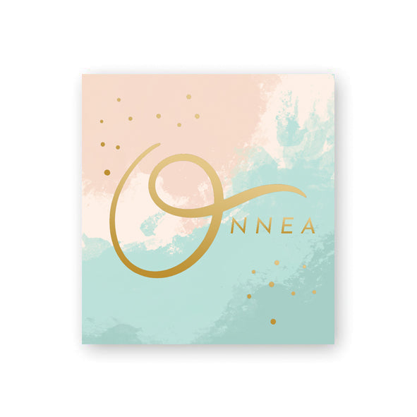 2-osainen pakettikortti kultafolioinnilla. Kortissa on teksti "Onnea" ja se on tyhjä sisältä. Kortin koko on 72 x 77 mm, kortin takaosassa on reikä lahjanauhalle. Design: Putinki Letters. Painettu Suomessa.