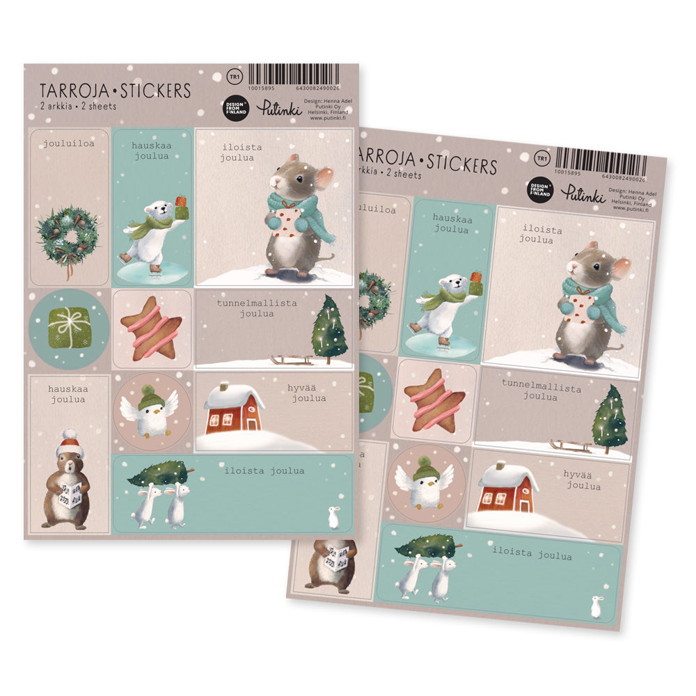 Pakkaus sisältää 2 samanlaista A5 kokoista arkkia joissa on erilaisia jouluisia pakettitarroja. Koko A5, yhteensä 20 tarraa. Kuvissa joulupukuiset hiiri, orava ja jääkarhu, joulukuusi, kranssi, pipari ym. Taustan värieinä pehmeät vihreä ja beige. Pakattu sellofaanipussiin, euro slot. Painettu Suomessa. Design: Henna Adel.