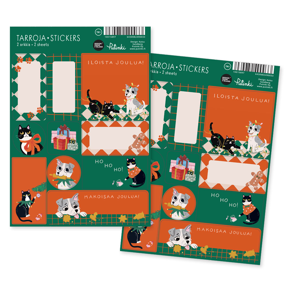 Pakkaus sisältää 2 samanlaista A5 kokoista arkkia joissa on erilaisia jouluisia pakettitarroja. Koko A5, yhteensä 20 tarraa. Tarrojen kuva-aiheena on Helvi-kissa ja Tauno-koira, taustan väreinä punainen, vihreä ja valkoinen. Pakattu sellofaanipussiin, euro slot. Painettu Suomessa. Design: Kaisu Sandberg.