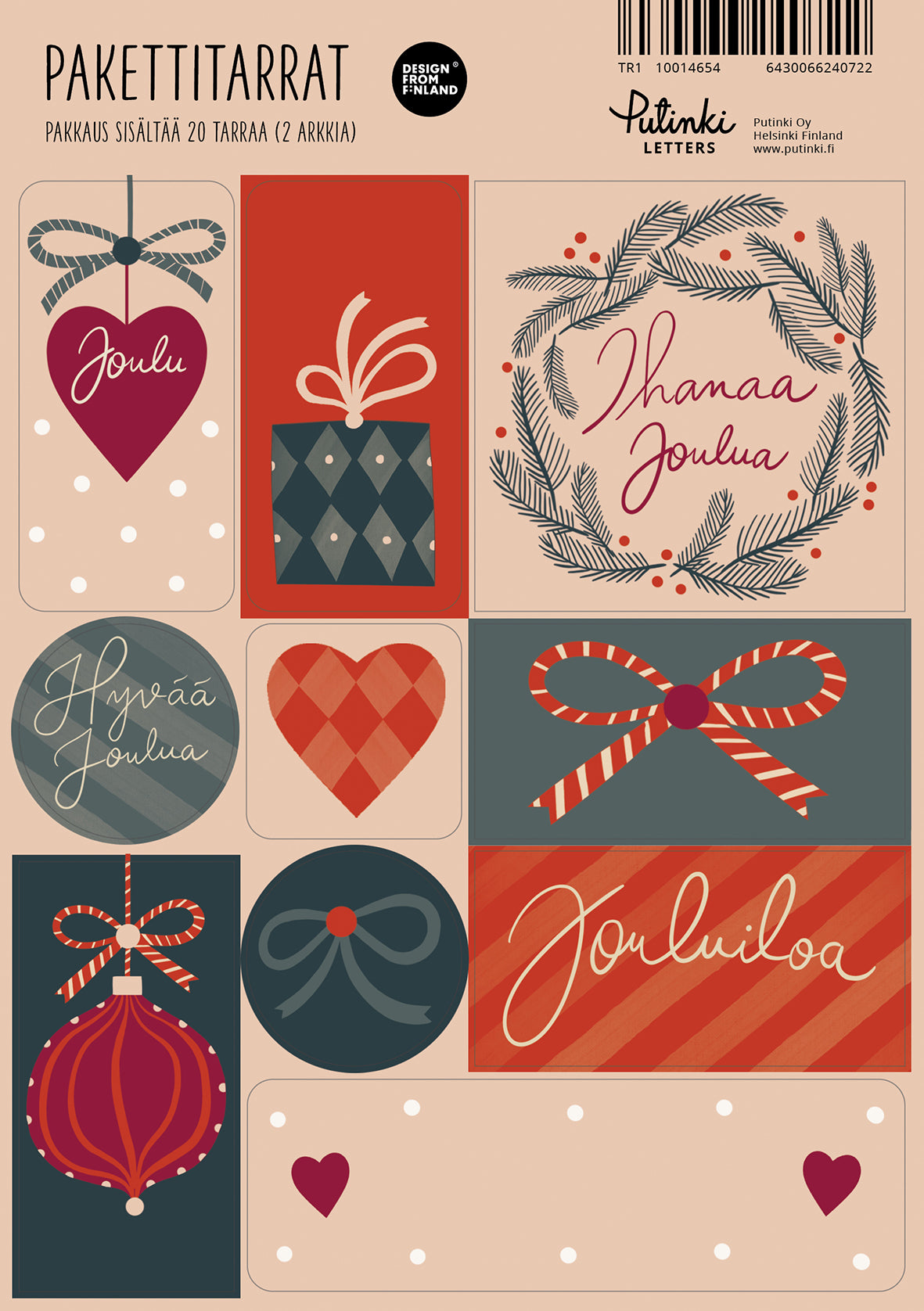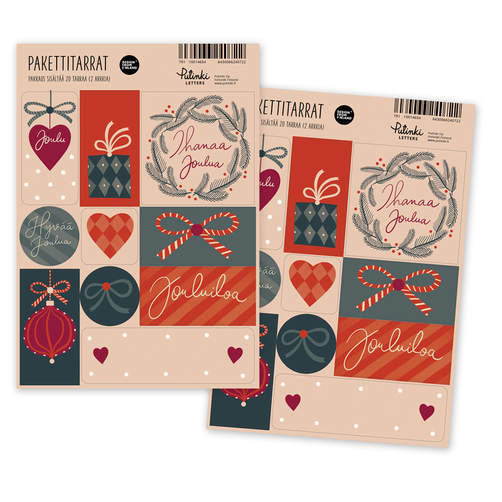 Viimeistele joululahjasi upeilla pakettitarroilla, joihin voit kirjoittaa vastaanottajan nimen ja joulun toivotukset. Pakkaus sisältää 2 samanlaista A5 kokoista arkkia, joissa on erilaisia jouluisia pakettitarroja. Design: Putinki Letters.