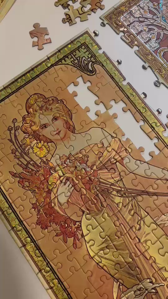 Paperblanksin palapeli Mucha: The Seasons (1900). Palapelissä on kuvana taiteilija Alphonse Muchan Art Nouveau-tyylin mukainen maalaus, jossa on esitetty neljä vuodeaikaa naishahmoina. Paperblanksin palapeleissa on upeat helmiäisen ja kullan hohtoiset viimeistelyt. Palapelissä on 1000 palaa ja valmiin palapelin mitat ovat 50.7 × 68.5 cm.