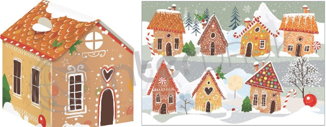 Jouluaiheinen 250 palan palapeli. Palapelin laatikko on talon muotoinen. Kuvassa on lumimaisemassa monta piparkakkutaloa. Valmiin palapelin koko on 48 x 33 cm. Design: Interdruk. Valmistusmaa Puola.