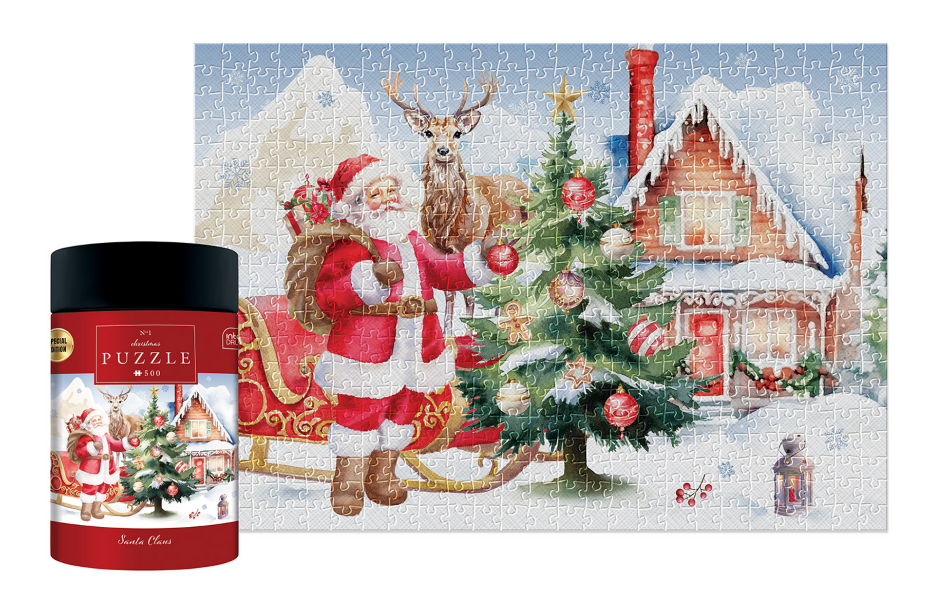 Jouluaiheinen 500 palan palapeli. Palapelin laatikko on lieriön muotoinen. Kuvassa on talvinen huvipuisto ja joulupukki kuumailmapallossa. Valmiin palapelin koko on 47 x 33 cm. Design: Interdruk. Valmistusmaa Puola.