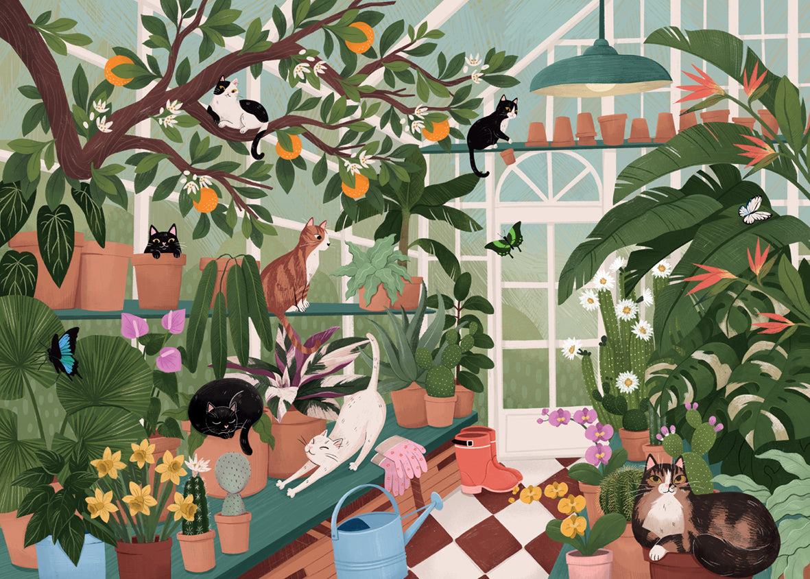 Tässä palapelissä on Kaisu Sandbergin kuvitus, jossa kissat ovat vallanneet kasvihuoneen. Kaisu Sandberg on kuvittaja ja graafikko Helsingistä. Kaisu on tehnyt paljon kuvituksia kortteihin, kalentereihin, paperituotteisiin ja lastenkirjoihin. Hänen värikkään tyylinsä tunnistaa herkullisesta väripaletista ja suloisista arkisista aiheista, kuten värikkäistä rakennuksista, viherkasveista ja kissoista. Käsillä tekeminen on Kaisulle luontaista, joten vapaa-ajalla hänet löytää keramiikkapajalta, remppapuuhista tai kukkapenkin ääreltä.