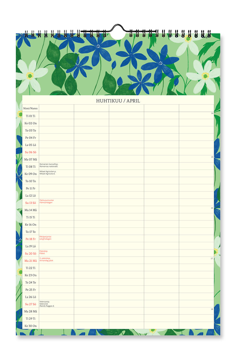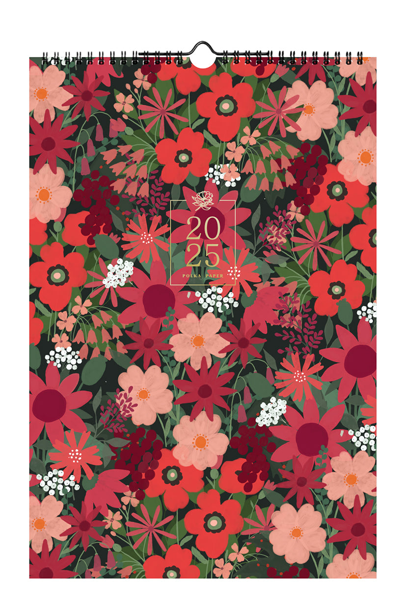 Seinäkalenteri 2025, Polka Paperin ihastuttavilla akvarellikuvituksilla. Kalenterissa on tilaa viiden henkilön merkinnöille. Kielet: suomi ja ruotsi. Koko 23 x 34 cm. Design: Polka Paper.