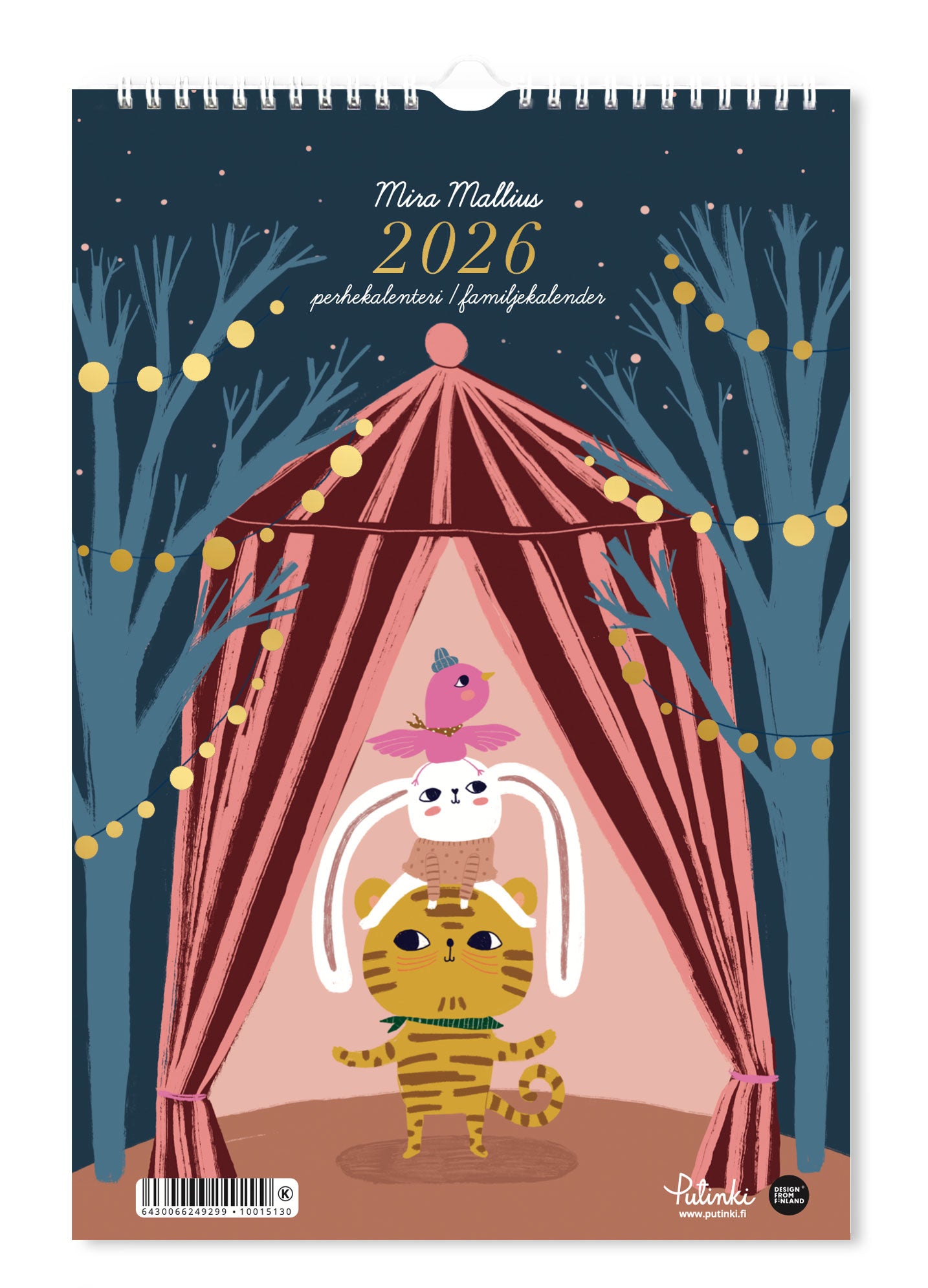 Seinäkalenteri 2026, Mira Malliuksen ihastuttavilla kuvituksilla. Kannen kuvassa on tiikeri, pupu ja lintu sirkusteltassa, iltataivas ja tunnelmallisia valonauhoja puissa. Kultafolioidut yksityiskohdat ja vuosiluku 2026. Kalenterissa on tilaa viiden henkilön merkinnöille. Kielet: suomi ja ruotsi, juhlapäivät ja kuun vaiheet. Koko 23 x 34 cm. Kalenteri on kierresidottu ja siinä on ripustuslenkki. Design: Mira Mallius.