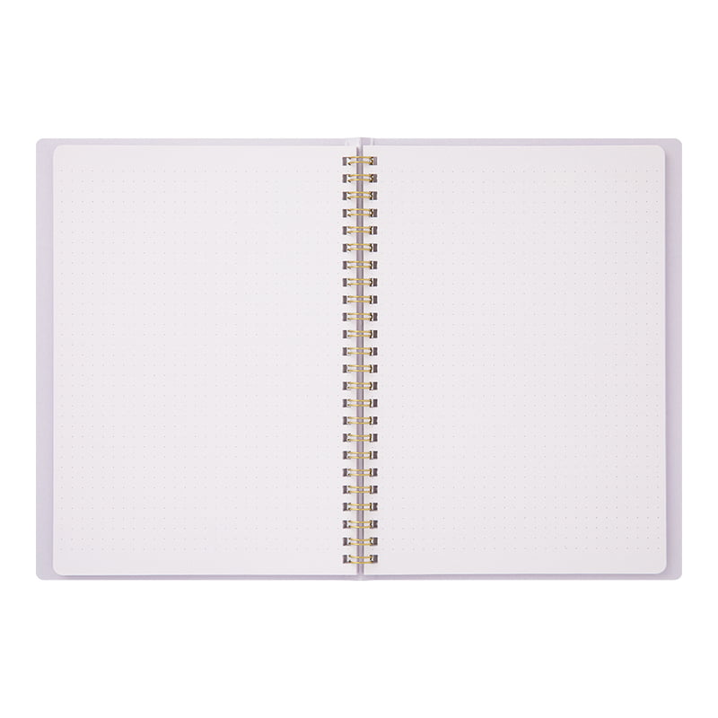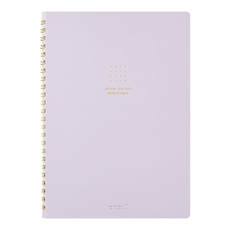 Pehmeäkantinen noin A5 kokoinen pistekirja Japanilaisen Midorin mallistoa. Lilan sävyisen muistikirjan kannessa on kullanvärinen foliointi. Sivut ovat kannen sävyyn sopivat ja niissä on himmeä pistekuviointi 5mm välein. Kaunis metallinen kierresidonta ja pyöristetyt sivujen kulmat antavat kirjalle viimeistellyn ilmeen. Kirjassa on 120 sivua. Kirjan koko on 218mm x 156mm x 15mm.