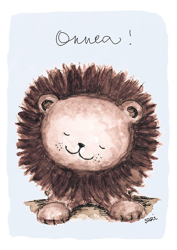 Laadukas kotimainen postikortti. Kuvassa Leijona ja teksti: "Onnea!". Tyhjä kääntöpuolelta. Koko 105 x 148 mm. Design: Sari's Artwork