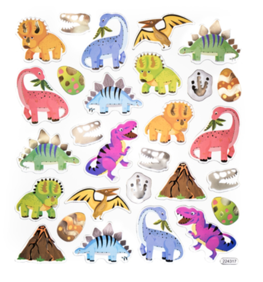 Värikkäitä dinosaurustarroja, joissa on kultaisia metallinhohtoisia yksityiskohtia. Tarrat ovat loistava lisä kaikenlaiseen koristeluun ja askarteluun. Kokeile lisätä tarroja myös kortteihin, kalentereihin, bujoihin ja scrapbookingiin.