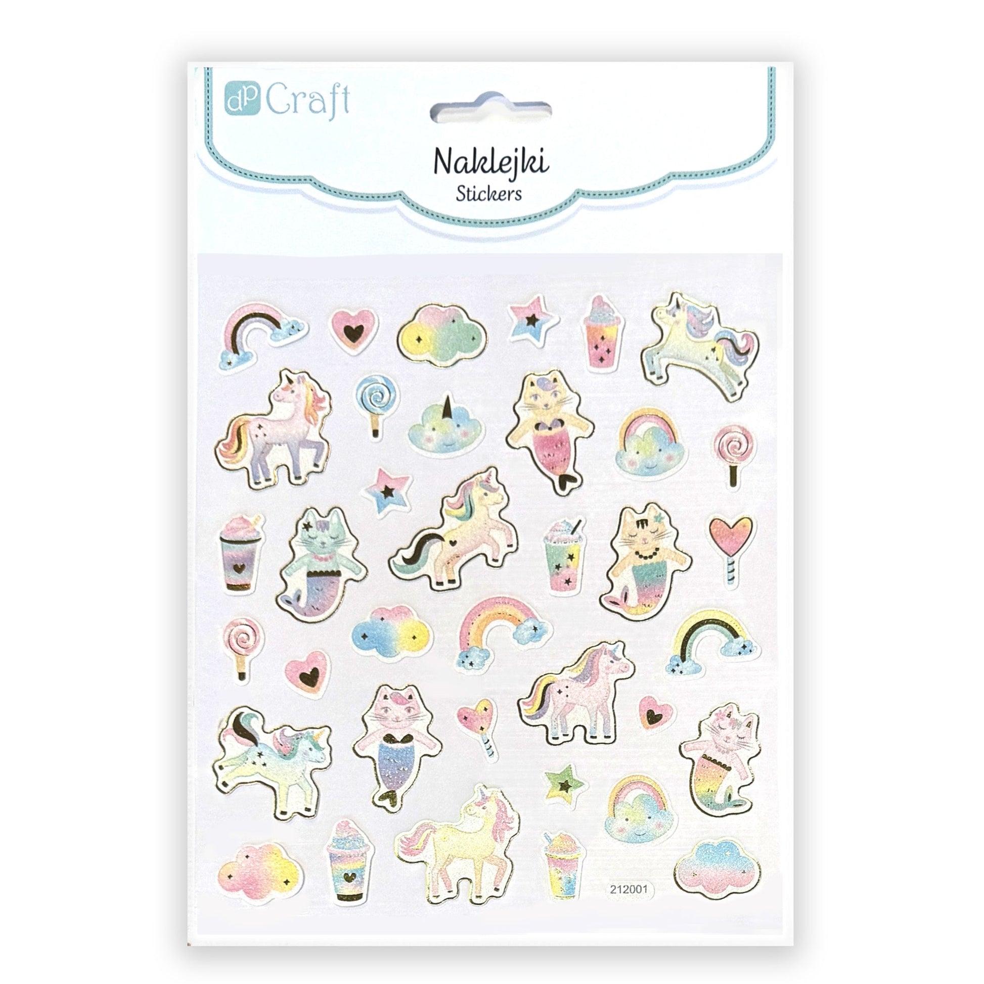 Pastellinsävyisiä tarroja yksisarvisista ja merenneitokissoista. Tarra-arkista löytyy myös herkkuja ja sateenkaaria. Tarroissa on kultaisia metallinhohtoisia yksityiskohtia ja helmiäisen hohtava pinta. Ne ovat loistava lisä kaikenlaiseen koristeluun ja askarteluun. Kokeile lisätä tarroja myös kortteihin, kalentereihin, bujoihin ja scrapbookingiin.