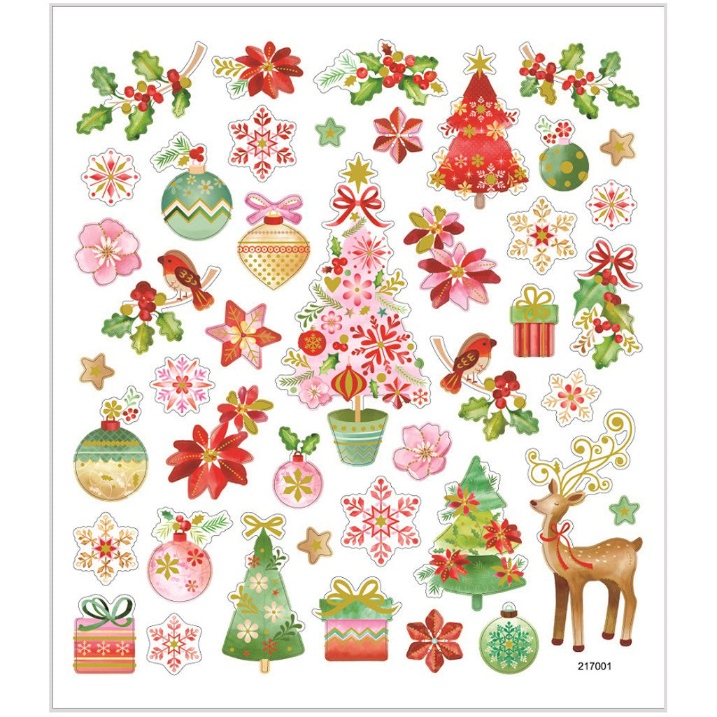 Jouluaiheinen tarra-arkki, jossa on kuvia joulukuusista, lahjapaketeista, eläimistä, kukista, lumihiutaleista ja koristepalloista pehmeissä punaisen, vihreän, vaaleanpunaisen ja kullan sävyissä. Täydellinen kortteihin, lahjapaketteihin, kalentereihin ja muihin jouluaskarteluihin. Arkin koko 15,5 x 21 cm.