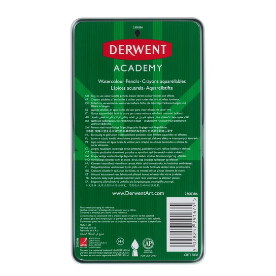 Aloitteleville artisteille suunnatut Derwent Academy- sarjan tuotteet ovat helppokäyttöisiä ja laadukkaita ja tarjoavat taiteilijalle koko värien kaleidoskoopin. Derwent Academy-sarjan vesiliukoiset värikynät ovat ideaalit väritykseen, piirtämiseen ja kuvitukseen. Valmistettu luonnollisesta puu-aineksesta ja laatumusteesta. Derwentin laatustandardien mukaisesti kynät siirtävät musteen paperille nopeasti ja tasaisesti; sävyt sulautuvat toisiinsa ja näin ollen uusien sävyjen luominen on helppoa ja vaivatonta. Watercolour-kynät käyttäytyvät akvarellivärien tavoin kun käytät värittämisessä apunasi sivellintä ja vettä. Skintones 12-lajitelma soveltuu etenkin muotokuvapiirustukseen. Lajitelma sisältää sävyt Cream, Sand, Rose, Bright Pink, Carmine Red, Terracotta, Brown, Raw Umber, Yellow Ochre, Burnt Umber, Black ja White.