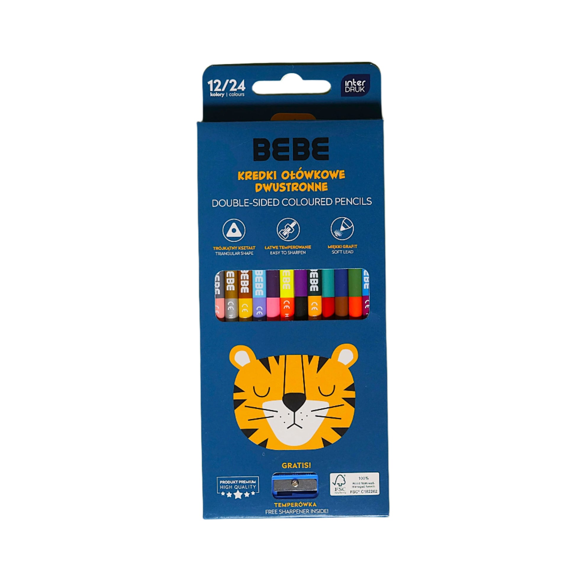 Bebe Friends -sarjan puuvärikynät. Kynä on kaksipuoleinen. Pakkauksessa on 12 kynää ja teroitin, yhteensä 24 eri väriä.