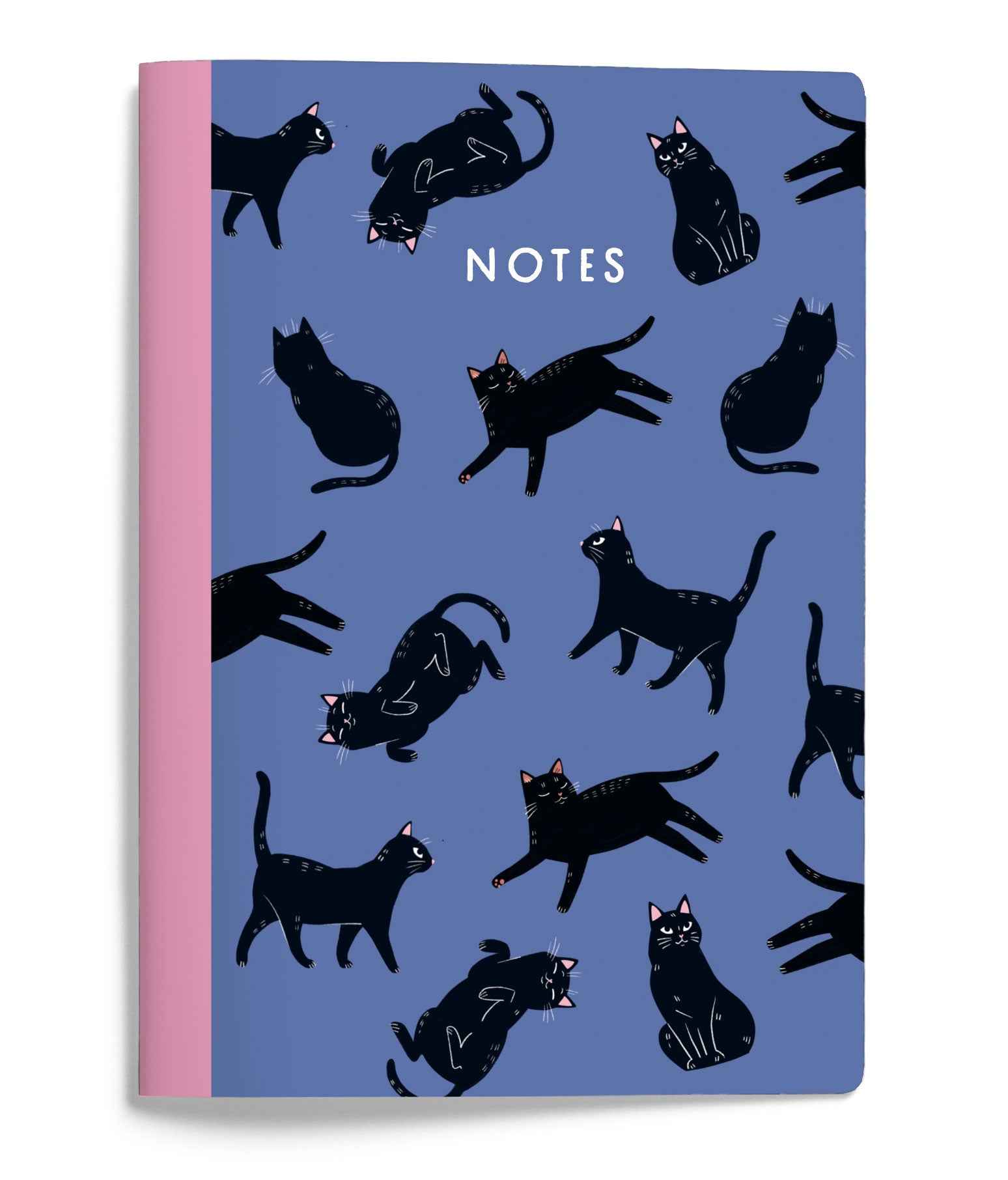 Pehmeäkantinen vihko, koko A5. Mattalaminoitu kansi, kuvassa sinisellä pohjalla kissakuosi, jossa musta kissa on monessa eri asennossa. Vihkon ylälaidassa lukee "Notes". Vihkossa on oranssit sisäkannet ja 48 ruudutettua sivua, paperin vahvuus 100 g. Pyöristetyt kulmat. Design: Kaisu Sandberg.