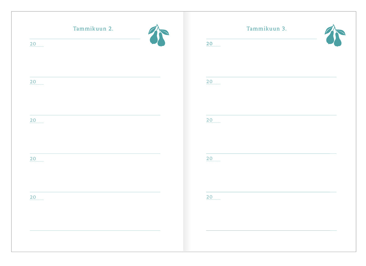 Putingin viiden vuoden päiväkirja. Päiväkirjassa on vuoden jokaiselle päivälle sivu viiden vuoden lyhyitä merkintöjä varten. Kirjan kannessa on mustalla pohjalla purppuran värisiä viikunoita, vaaleanpunaisia kukkia ja vihreitä lehtiä, sekä kullan värinen folioitu teksti "Ajatus päivässä" "Viiden vuoden päiväkirja". Kirjassa on lukunauha ja värilliset esilehdet ja kirjan koko on 123 x 172 mm, siinä on 384 sivua. Sisäpaperi: Amber Graphic 100g. Design: Polka Paper. Tuotteessa on Design from Finland -merkki.