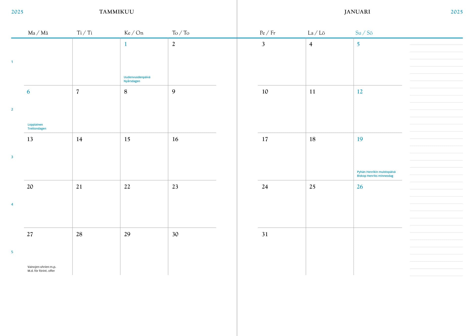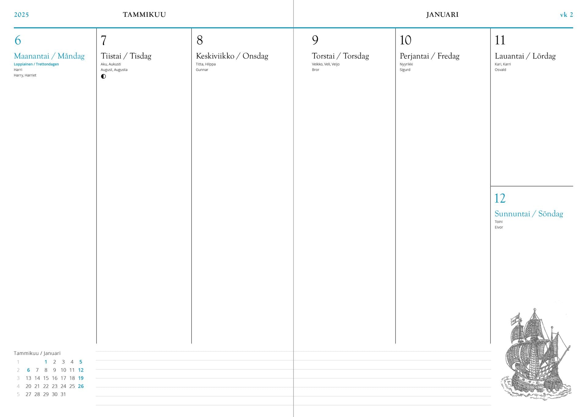 Kovakantinen viikkopäivyri vuodelle 2025. Kannessa kultafolioituja yksityiskohtia. Kalenterin kansi ja sisäsivujen kuvituskuvat ovat John Nurmisen säätiön arkistoista. Aukeamalla viikkonäkymä ja tilaa muistiinpanoille. Kirjalla on kangasselkä ja lukunauha. Koko 15 x 21,5 cm (A5). Kielet: suomi ja ruotsi. Sisältää suomalaiset ja suomenruotsalaiset nimi- ja liputuspäivät, sekä kuun vaiheet.