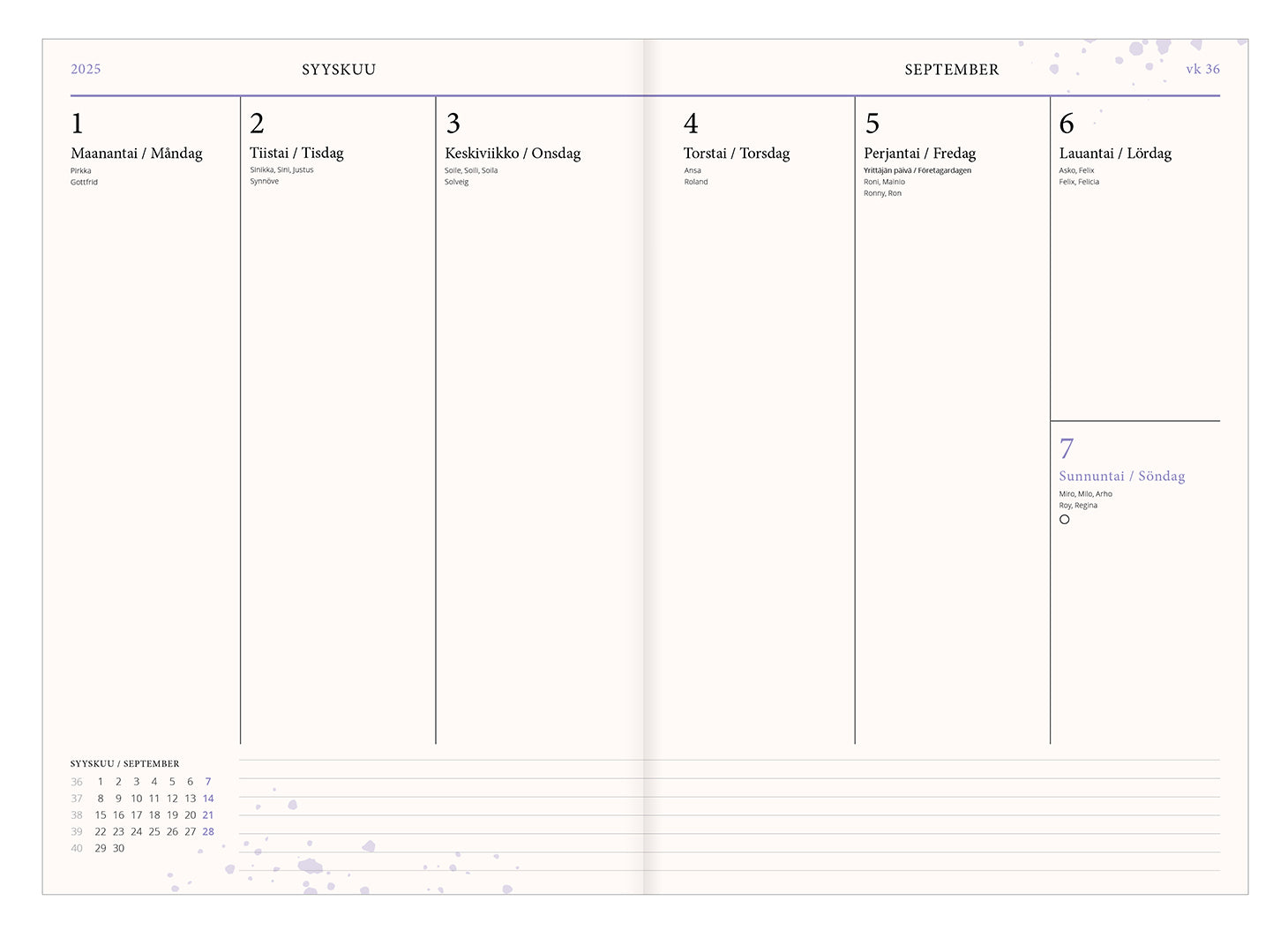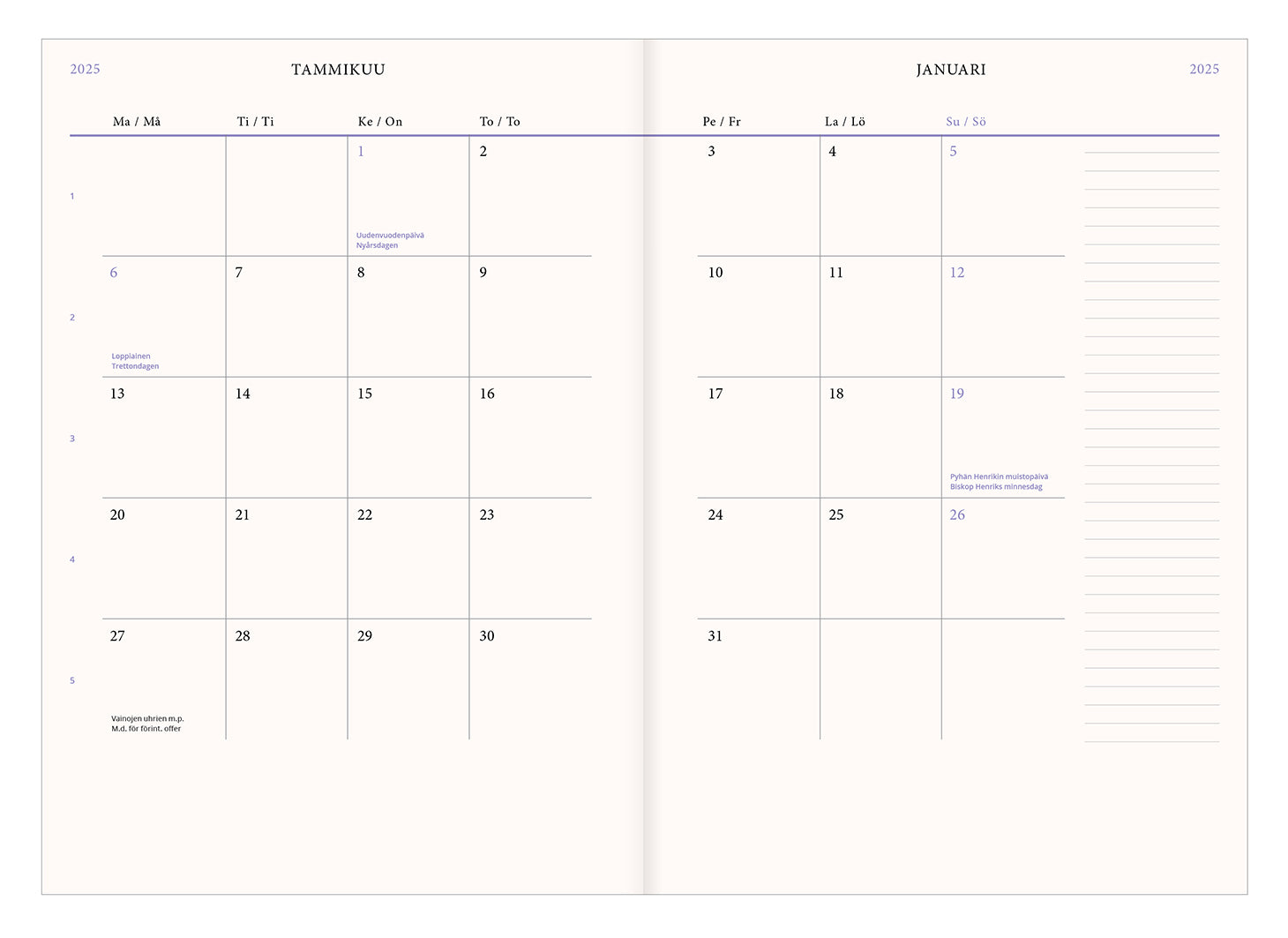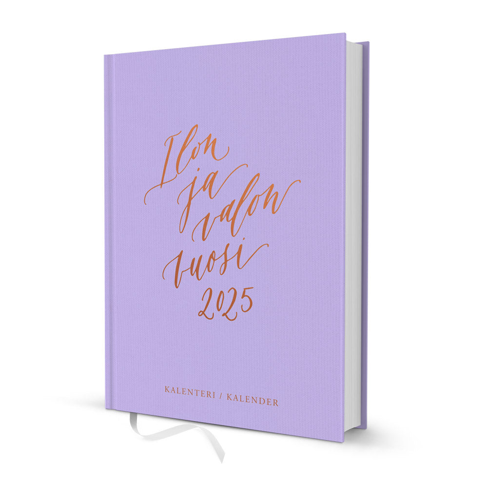 Kalligrafiastudion kovakantinen viikkopäivyri 2025 "Ilon ja valon vuosi 2025" Kluuttikansi, kuparifolioidut yksityiskohdat Koko: A5 (14,8 x 21 cm) Kielet: suomi ja ruotsi Suomalaiset ja suomenruotsalaiset nimi- ja liputuspäivät Kuun vaiheet Lukunauha ja päivyrin lopussa muistiinpanosivuja.
