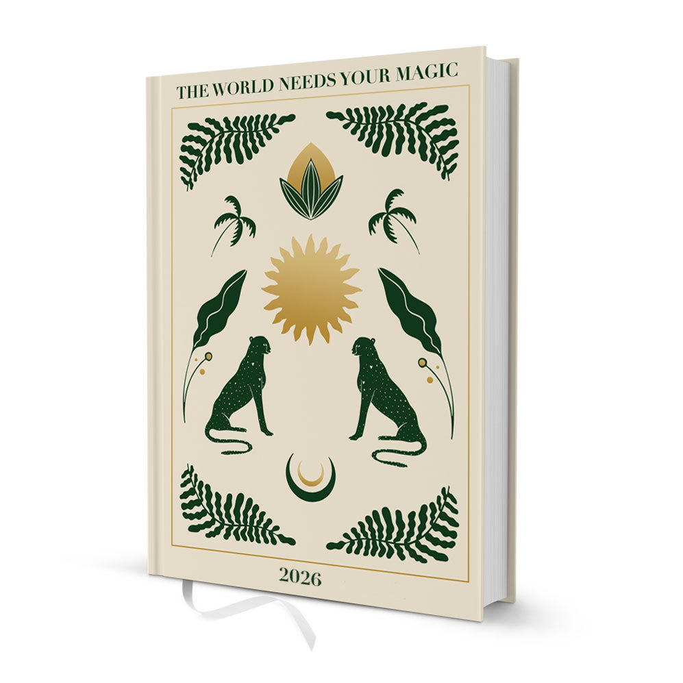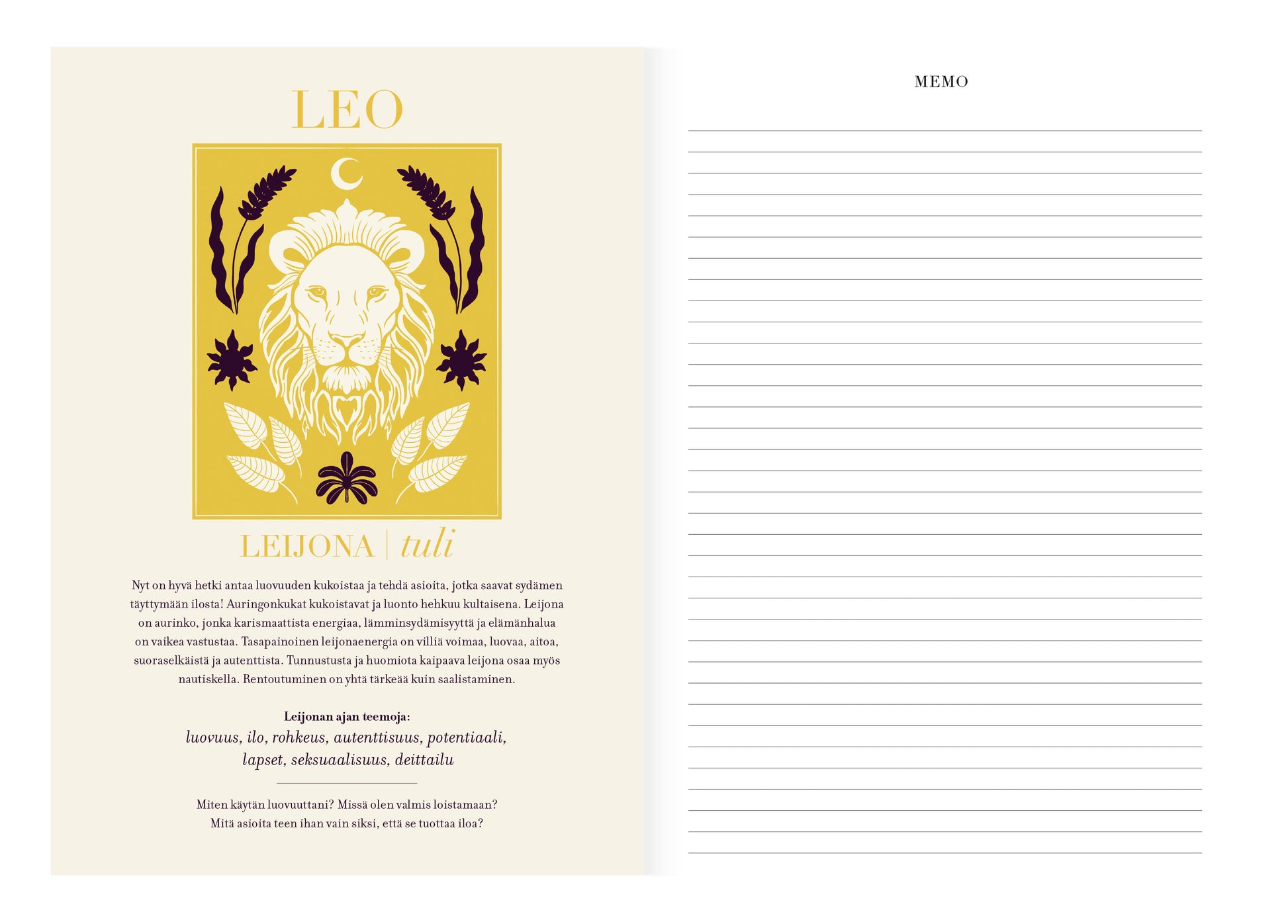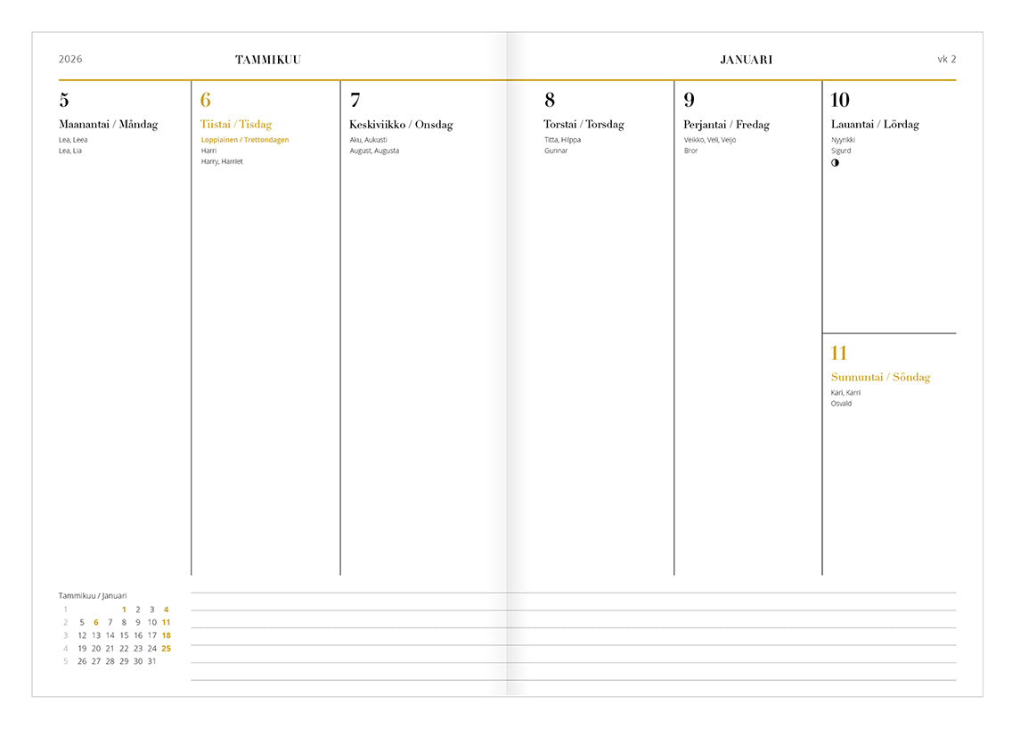 Pieni kovakantinen viikkopäivyri vuodelle 2026 Uhana Designin horoskooppiaiheisilla kuvituksilla. Kannessa kultainen aurinko ja tummanvihreitä graafisia kuvioita luonnonvalkoisella pohjalla. Aukeamalla viikkonäkymä ja tilaa muistiinpanoille, sisäkuvituksia. Sisältää kuukausinäkymän joka kuukaudelle, Koko: 12 x 17 cm, kalenterissa on lukunauha. Kielet: suomi ja ruotsi. Sisältää suomalaiset ja suomenruotsalaiset nimi- ja liputuspäivät, sekä kuun vaiheet. Design: Uhana Design.