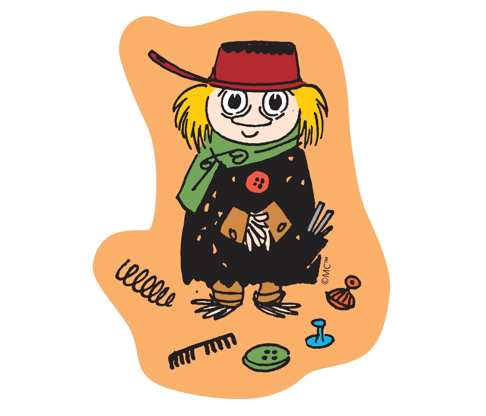 Vinyylitarra, jossa Hosuli kattila päässään ja nappeja ympäriinsä. Oranssi tausta. Koko noin 9 x 9 cm. Painettu Suomessa. © Moomin Characters™