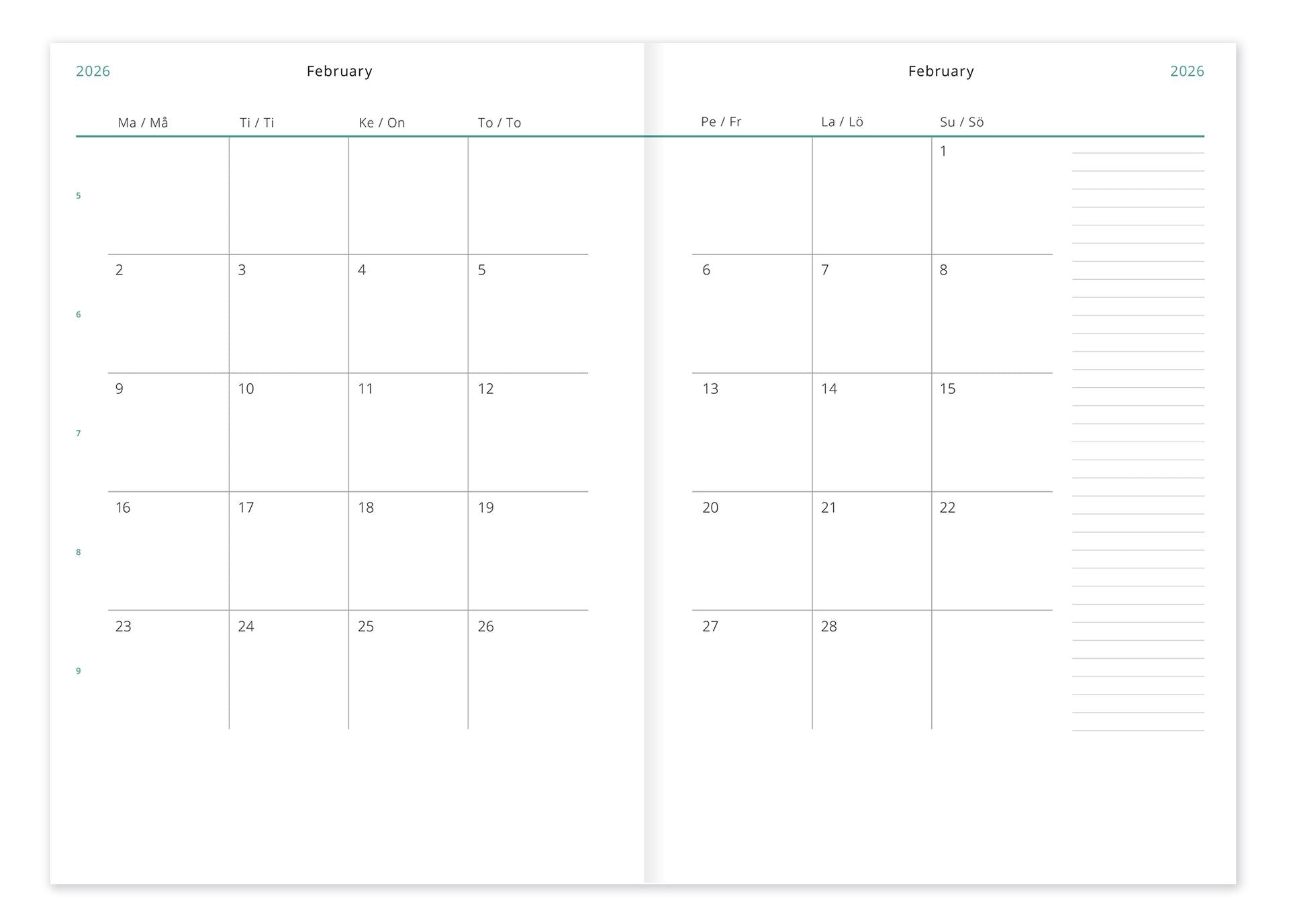 Kovakantinen Muumi-viikkopäivyri vuodelle 2026. Englanninkielinen versio. Kalenterin kannen originaali kuva on Tove Janssonin kirjasta Muumipeikko ja pyrstötähti. Kannessa folioitu vuosiluku. Aukeamalla viikkonäkymä ja tilaa muistiinpanoille. Sisältää kuukausinäkymän joka kuukaudelle ja lukunauhan. Koko 15 x 21 cm (A5). Kielet: englanti.